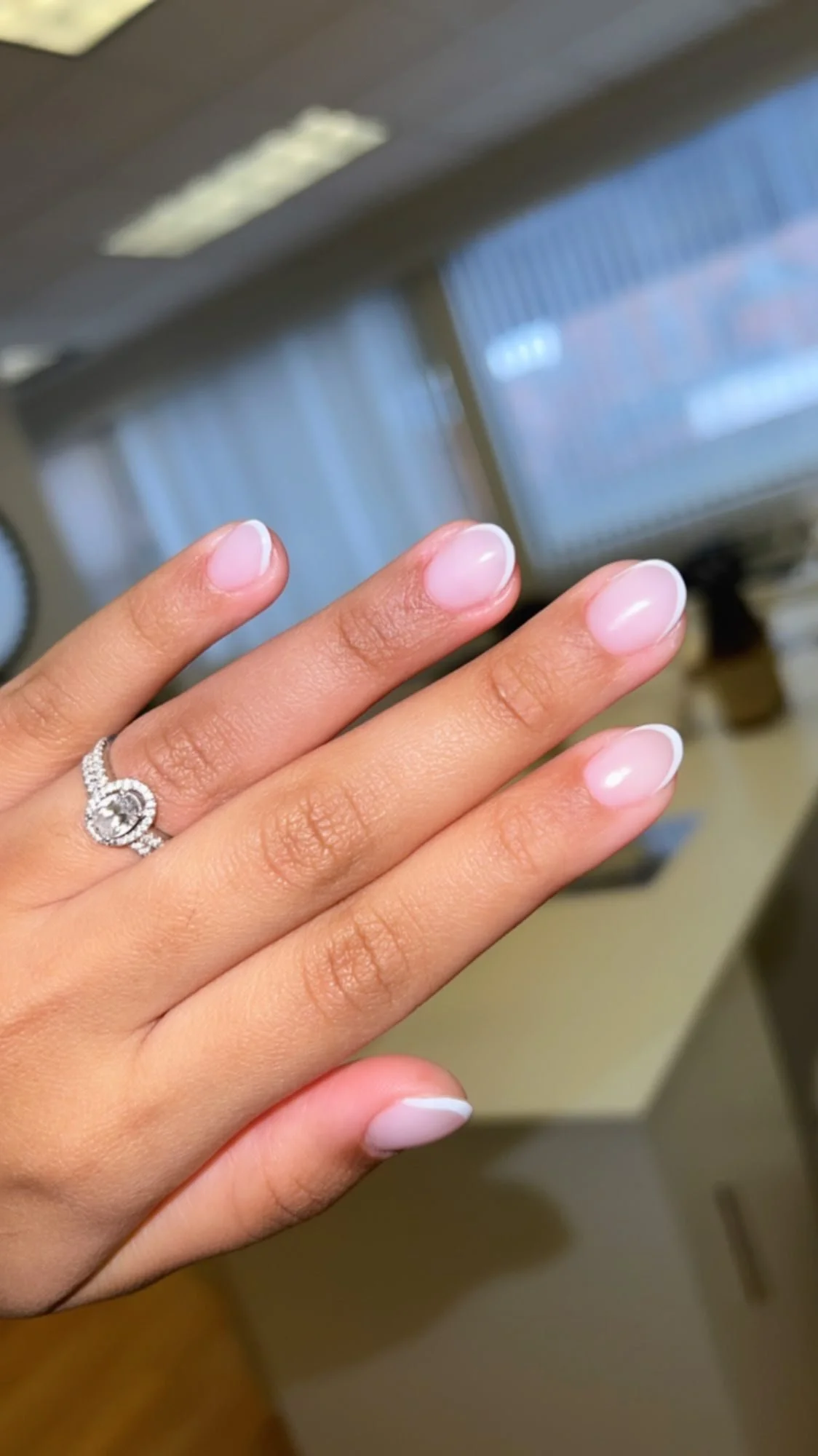 Close-up of hand with long, almond-shaped nails painted in a pink and white gradient style.